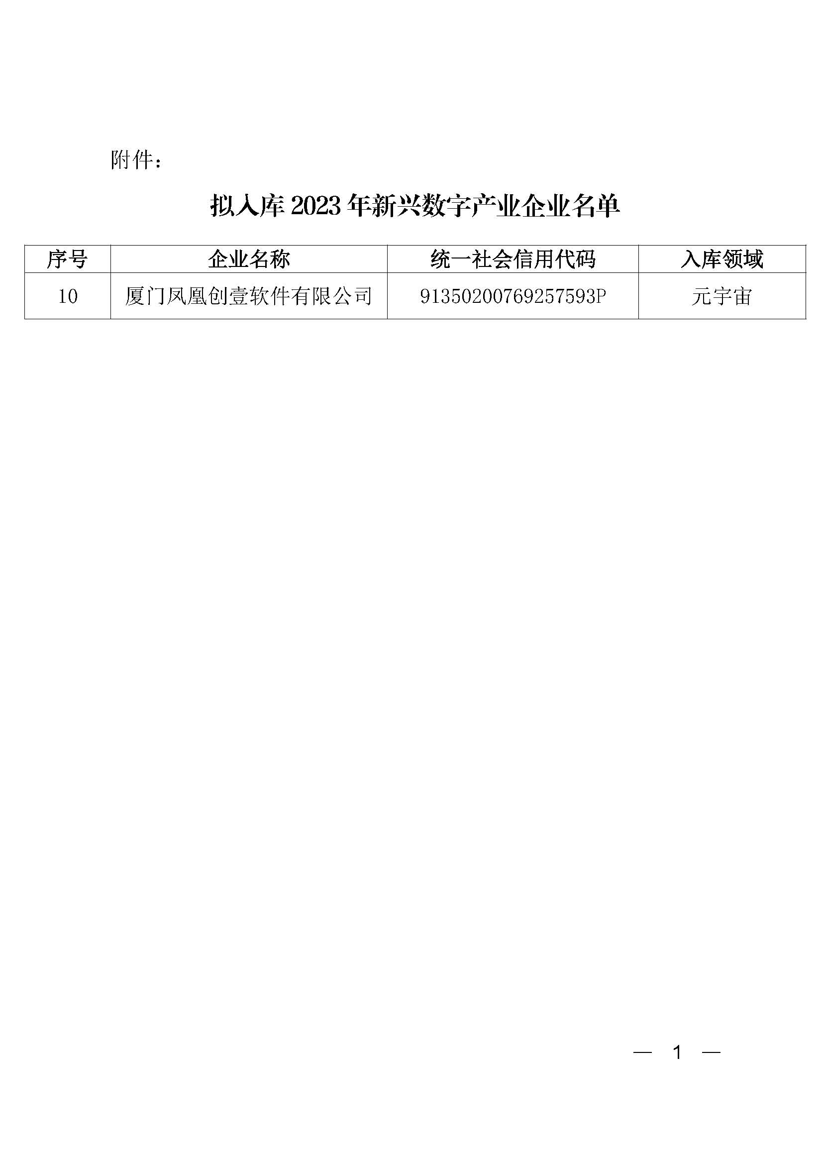 11月1日,廈門市工業(yè)和信息化局、廈門市大數(shù)據(jù)管理局發(fā)布關(guān)于擬入庫2023年廈門市新興數(shù)字產(chǎn)業(yè)企業(yè)名單的公示通知,鳳凰創(chuàng)壹作為元宇宙領(lǐng)域企業(yè)進入擬入庫2023年廈門市新興數(shù)字產(chǎn)業(yè)企業(yè)名單。