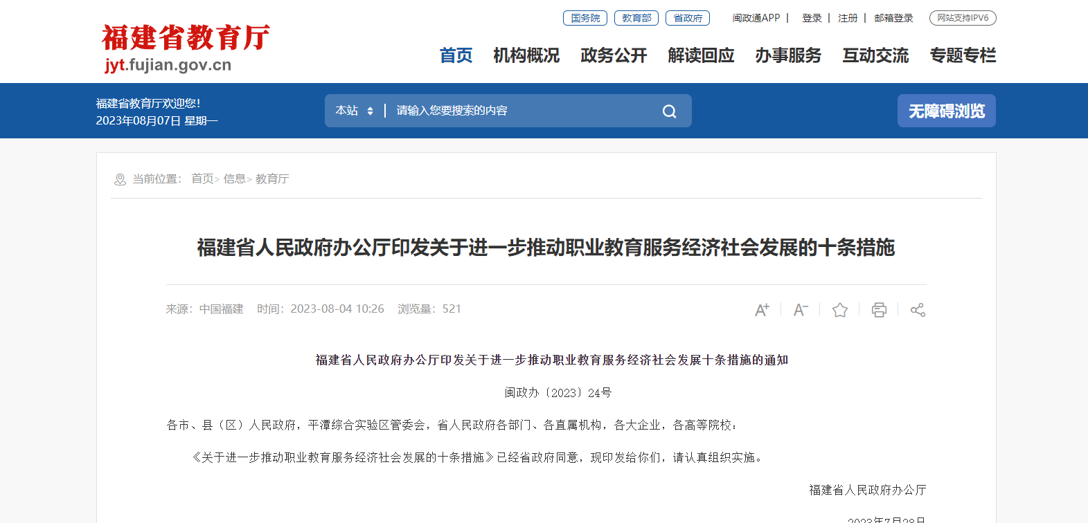 為深入學習貫徹黨的二十大精神和習近平總書記關于職業(yè)教育的重要指示精神,深入落實全國職業(yè)教育大會部署,根據(jù)中共中央辦公廳、國務院辦公廳印發(fā)《關于深化現(xiàn)代職業(yè)教育體系建設改革的意見》,按照聚焦全省高質(zhì)量發(fā)展現(xiàn)實需求,深化產(chǎn)教融合、校企合作,促進教育鏈、人才鏈與產(chǎn)業(yè)鏈、創(chuàng)新鏈銜接的要求,結合我省經(jīng)濟社會發(fā)展對職業(yè)教育高質(zhì)量人才培養(yǎng)的迫切期盼,深入推進福建特色現(xiàn)代職業(yè)教育體系建設,提出以下十條措施。