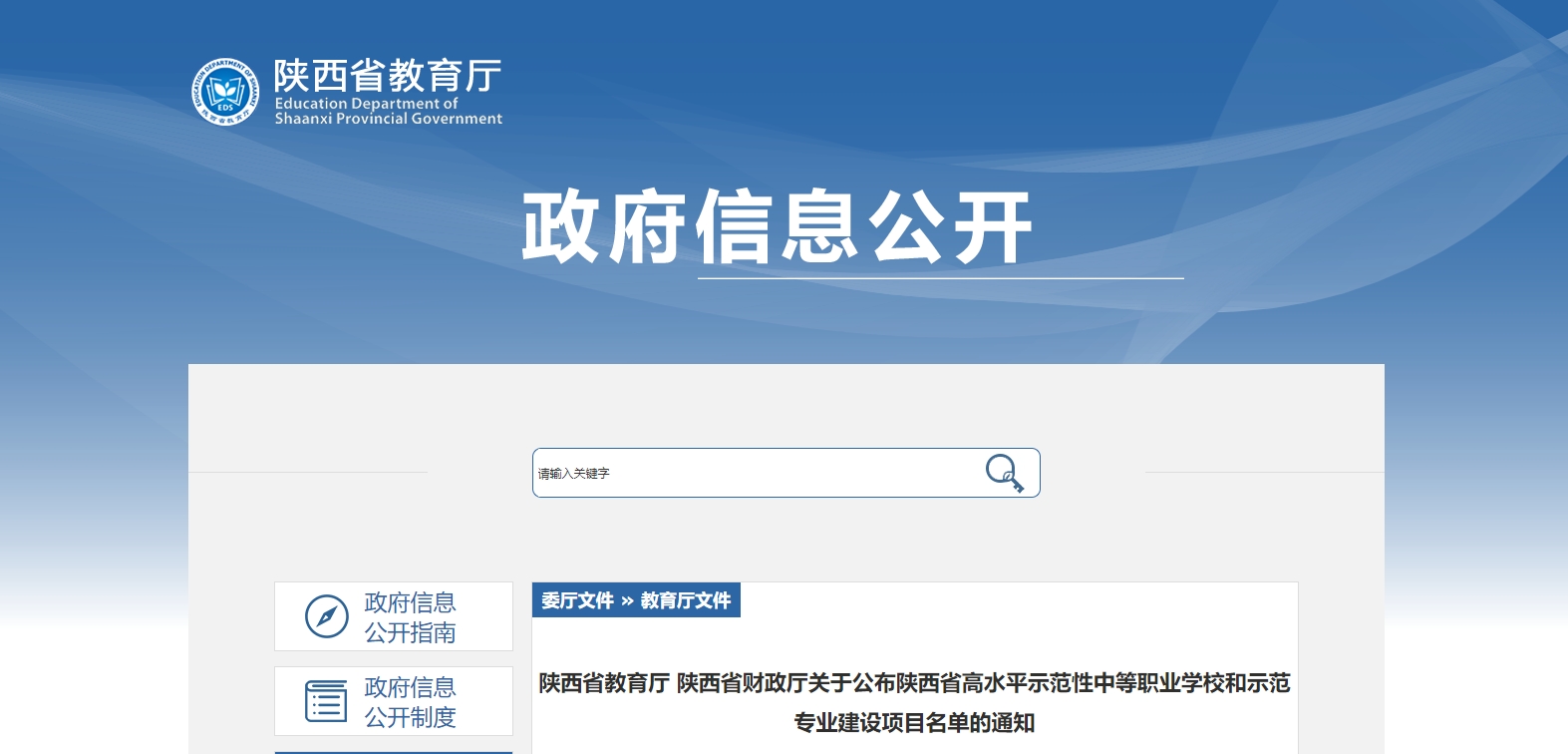 近日,陜西省教育廳、陜西省財政廳發(fā)布陜西省高水平示范性中等職業(yè)學校和示范專業(yè)建設(shè)項目名單的通知,將50所陜西省高水平示范性中等職業(yè)學校和150個示范專業(yè)建設(shè)項目(以下簡稱“雙示范”建設(shè)項目)名單予以公布。