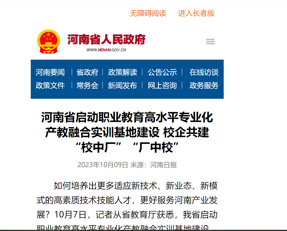 實訓(xùn)基地是培養(yǎng)高素質(zhì)技術(shù)技能人才的重要平臺,也是打破傳統(tǒng)教育與產(chǎn)業(yè)之間隔閡的有效通道。對接經(jīng)濟轉(zhuǎn)型發(fā)展、產(chǎn)業(yè)結(jié)構(gòu)升級和創(chuàng)新驅(qū)動需求,河南省將推動地方政府、職業(yè)學(xué)校、行業(yè)企業(yè)共同建設(shè)一批能滿足實踐教學(xué)、社會培訓(xùn)、企業(yè)真實生產(chǎn)和社會技術(shù)服務(wù)等需求的高水平專業(yè)化產(chǎn)教融合實訓(xùn)基地,在實踐教學(xué)模式創(chuàng)新、校企協(xié)同育人及技能培訓(xùn)、產(chǎn)學(xué)研創(chuàng)深度融合等方面發(fā)揮示范輻射作用。