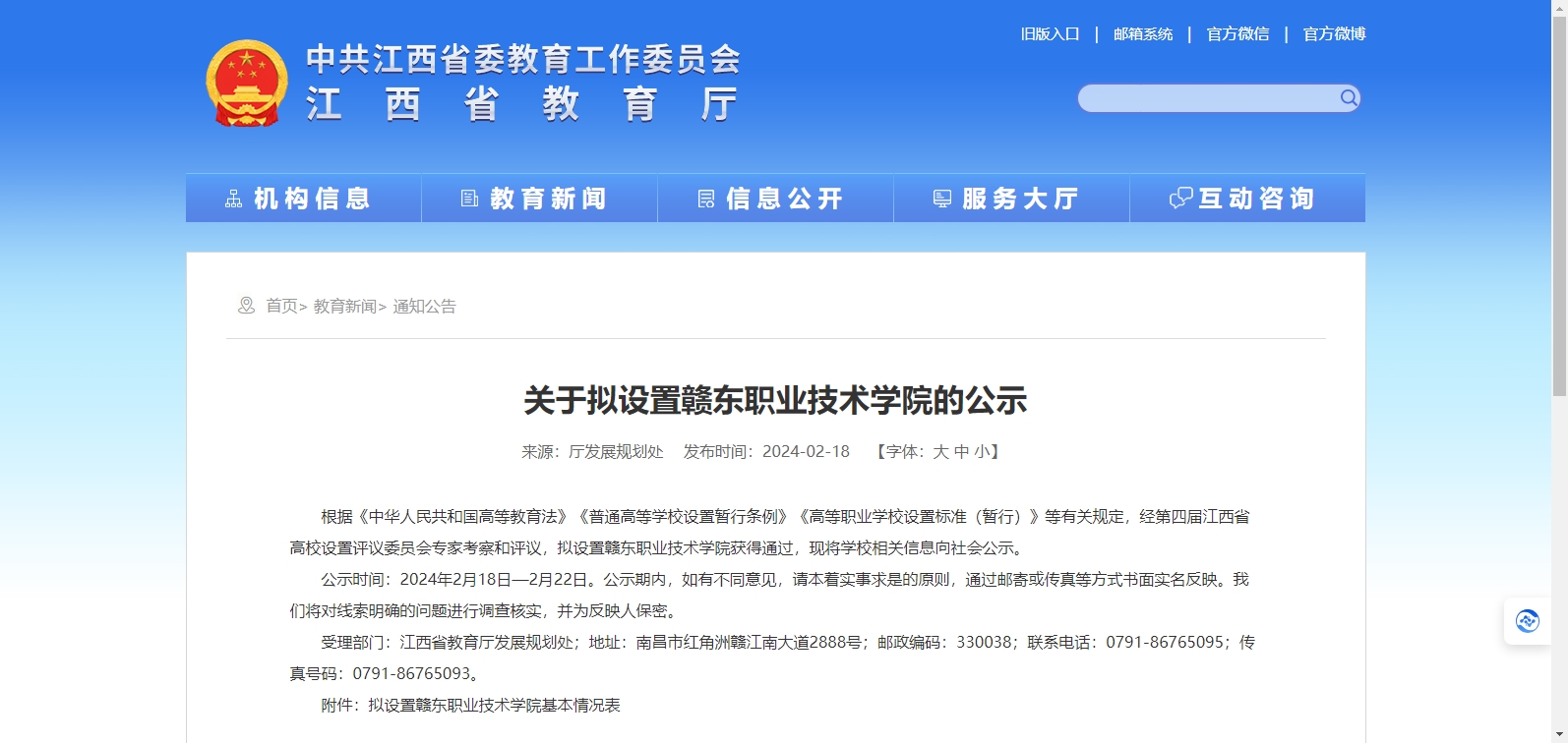 根據(jù)《中華人民共和國高等教育法》《普通高等學(xué)校設(shè)置暫行條例》《高等職業(yè)學(xué)校設(shè)置標(biāo)準(zhǔn)(暫行)》等有關(guān)規(guī)定,經(jīng)第四屆江西省高校設(shè)置評(píng)議委員會(huì)專家考察和評(píng)議,擬設(shè)置贛東職業(yè)技術(shù)學(xué)院獲得通過,現(xiàn)將學(xué)校相關(guān)信息向社會(huì)公示。