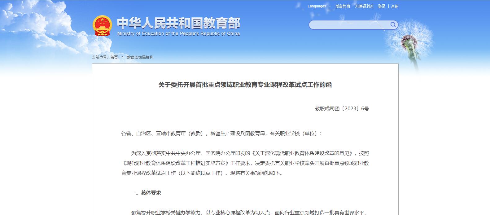教育部職成司發(fā)布關于委托開展首批重點領域職業(yè)教育專業(yè)課程改革試點工作的函