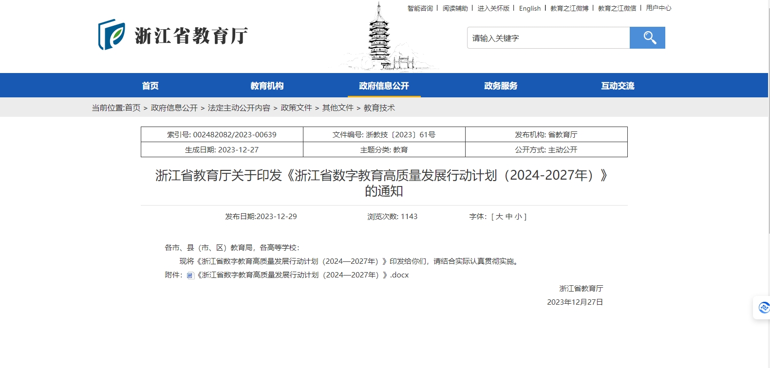 浙江省教育廳關于印發(fā)《浙江省數(shù)字教育高質量發(fā)展行動計劃(2024-2027年)》的通知