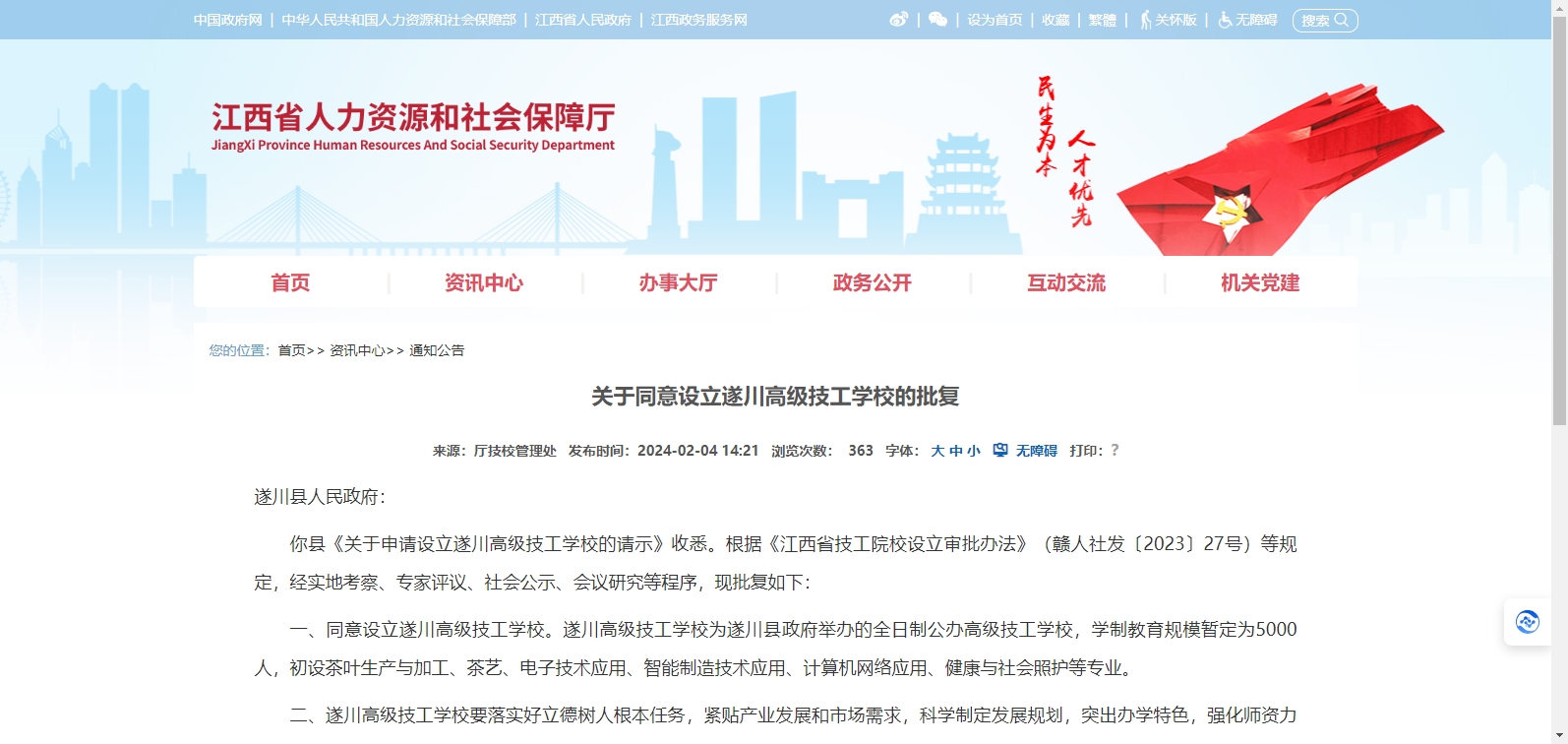 關(guān)于同意設(shè)立遂川高級技工學(xué)校的批復(fù) 遂川縣人民政府: 你縣《關(guān)于申請?jiān)O(shè)立遂川高級技工學(xué)校的請示》收悉。根據(jù)《江西省技工院校設(shè)立審批辦法》(贛人社發(fā)〔202......